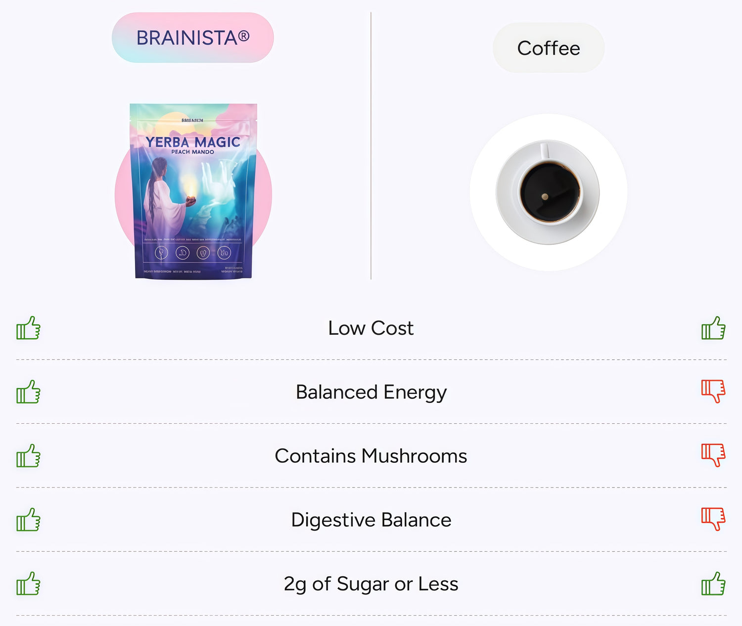 Yerba Magic solves what they can't. Yerba mate delivers clean, sustained energy. Lion's Mane and L Theanine sharpen your focus without anxiety. Probiotics keep your gut calm and balanced.